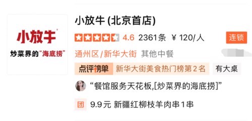 近年來,小放牛餐飲在部分區(qū)域經(jīng)營店鋪的海報、菜單、座牌等眾多裝潢以及官方微信公眾號、網(wǎng)絡(luò)媒體上等宣傳活動中,多次使用了“炒菜界的海底撈”標志。如在大眾點評平臺,位于北京通州的小放牛位列“新華大街美食熱門榜第2名”,店鋪展示圖片中不僅有“小放牛”名稱,還有“炒菜界的海里撈”宣傳語。