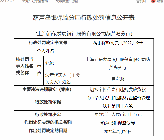 7月22日消息,葫蘆島銀保監(jiān)分局行政處罰信息公開表顯示,上海浦發(fā)銀行葫蘆島分行因遲報(bào)案件信息和違規(guī)發(fā)放貸款被葫蘆島銀保監(jiān)分局罰款合計(jì)人民幣四十萬元?!?/p>