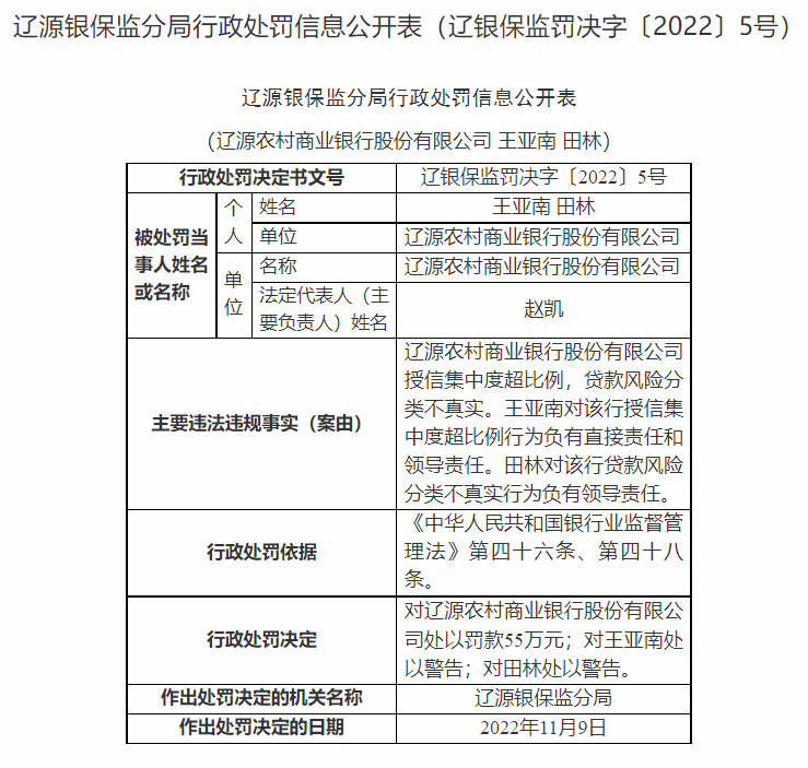 11月15日,中國銀保監(jiān)會官網(wǎng)更新的處罰公告顯示,遼源農(nóng)村商業(yè)銀行因授信集中度超比例、貸款風(fēng)險分類不真實,被罰55萬元。