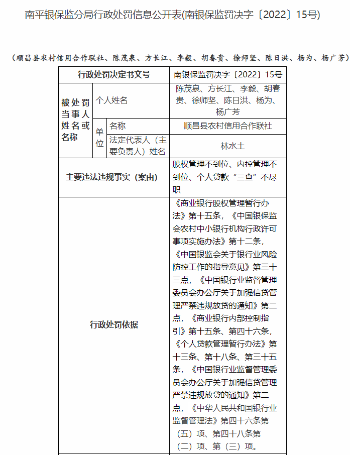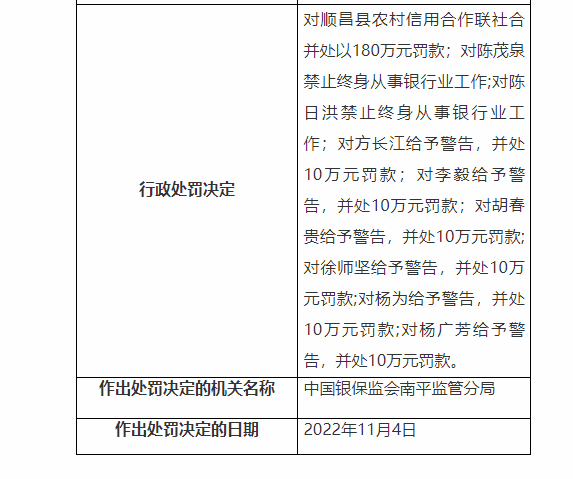 11月15日,中國(guó)銀保監(jiān)會(huì)官網(wǎng)更新的處罰公告顯示,順昌縣農(nóng)村信用合作聯(lián)社因個(gè)人貸款“三查”不盡職等違規(guī)被罰180萬(wàn)元,8名責(zé)任人被罰。
