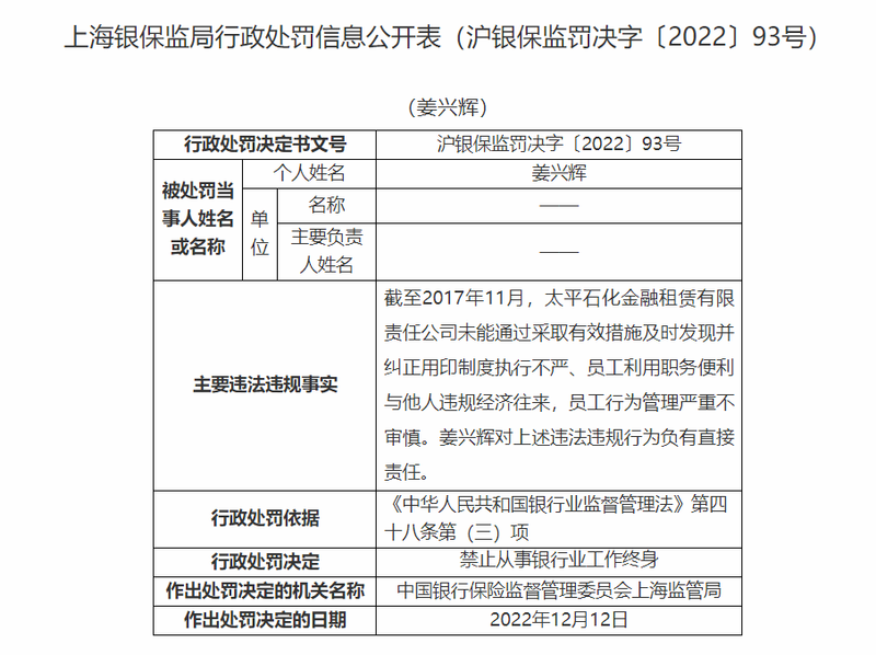 19日,上海銀保監(jiān)局針對(duì)太平石化金融租賃有限責(zé)任公司(下稱“太平石化金租”)1名內(nèi)部人員姜興輝,開(kāi)出了1張行政處罰信息公開(kāi)表。
