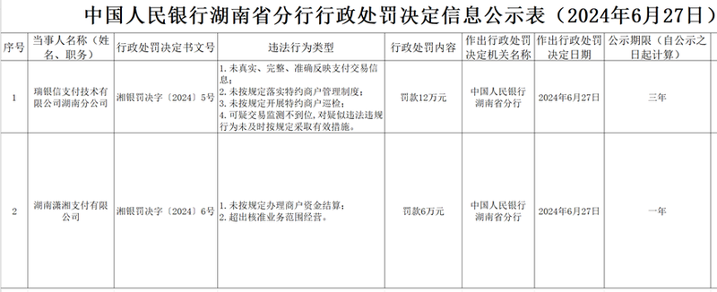 近日,中國人民銀行湖南省分行發(fā)布的行政處罰決定信息顯示,瑞銀信支付技術(shù)有限公司(下稱“瑞銀信”)湖南分公司和湖南瀟湘支付有限公司(下稱“瀟湘支付”)同時(shí)被罰,罰款共計(jì)18萬元。