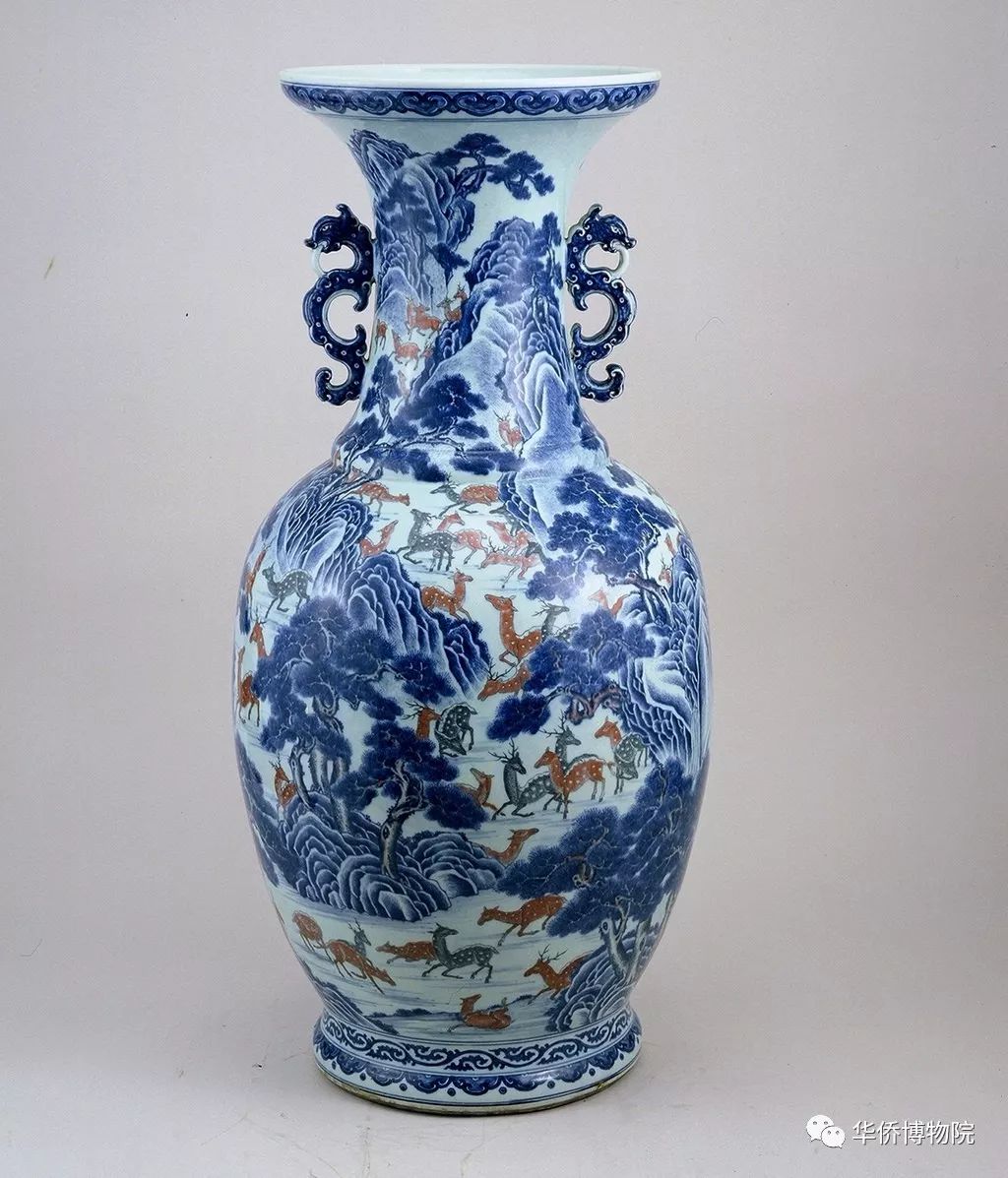 淺盤口,瓶口沿繪一圈規(guī)整的如意云紋。長頸豐肩,頸兩側(cè)置對(duì)稱夔龍耳,玲瓏別致。長鼓腹,底足略向外撇,泥鰍背狀,通體飾釉,底足露胎,釉質(zhì)晶瑩光潤,胎體厚重,胎質(zhì)堅(jiān)細(xì)潔白,縝密堅(jiān)硬。整個(gè)器型造型飽滿穩(wěn)健,制作精美,青花、釉里紅、豆青三色描繪山水、松柏和一百多只姿態(tài)各異的鹿。該瓶通體釉色晶瑩潤澤,柔和清爽,以青花為主色調(diào),以疏淡清秀的筆墨,營造出山環(huán)水繞,煙靄蒼茫,峰巒疊嶂、松樹婀娜的壯麗畫面。在山水間,散布著一百多只梅花鹿,它們?nèi)宄扇?,或覓食溪澗之畔,或閑憩松巖蔭下,或在松林中奔跑追逐,整個(gè)畫面意境閑淡,神韻清曠,靜動(dòng)相宜,不但體現(xiàn)了生態(tài)自然的美好景象,也象征著吉祥快樂。