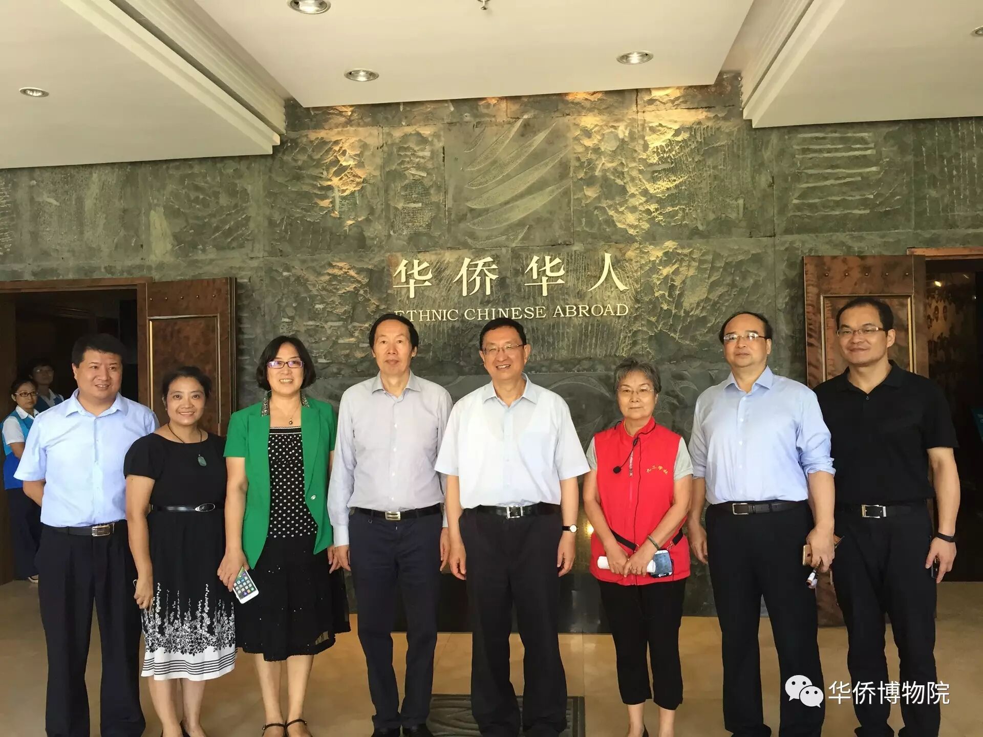 文化部部長雒樹剛(右四)、國家文物局局長劉玉珠(右五)、福建省文物局局長傅柒生(右一)、廈門市文化廣電新聞出版局副局長李云麗(左三)、華僑博物院院長曾瑩(左二)、華僑博物院副院長鐘志誠(左一)等在《華僑華人》基本陳列展廳外合影留念