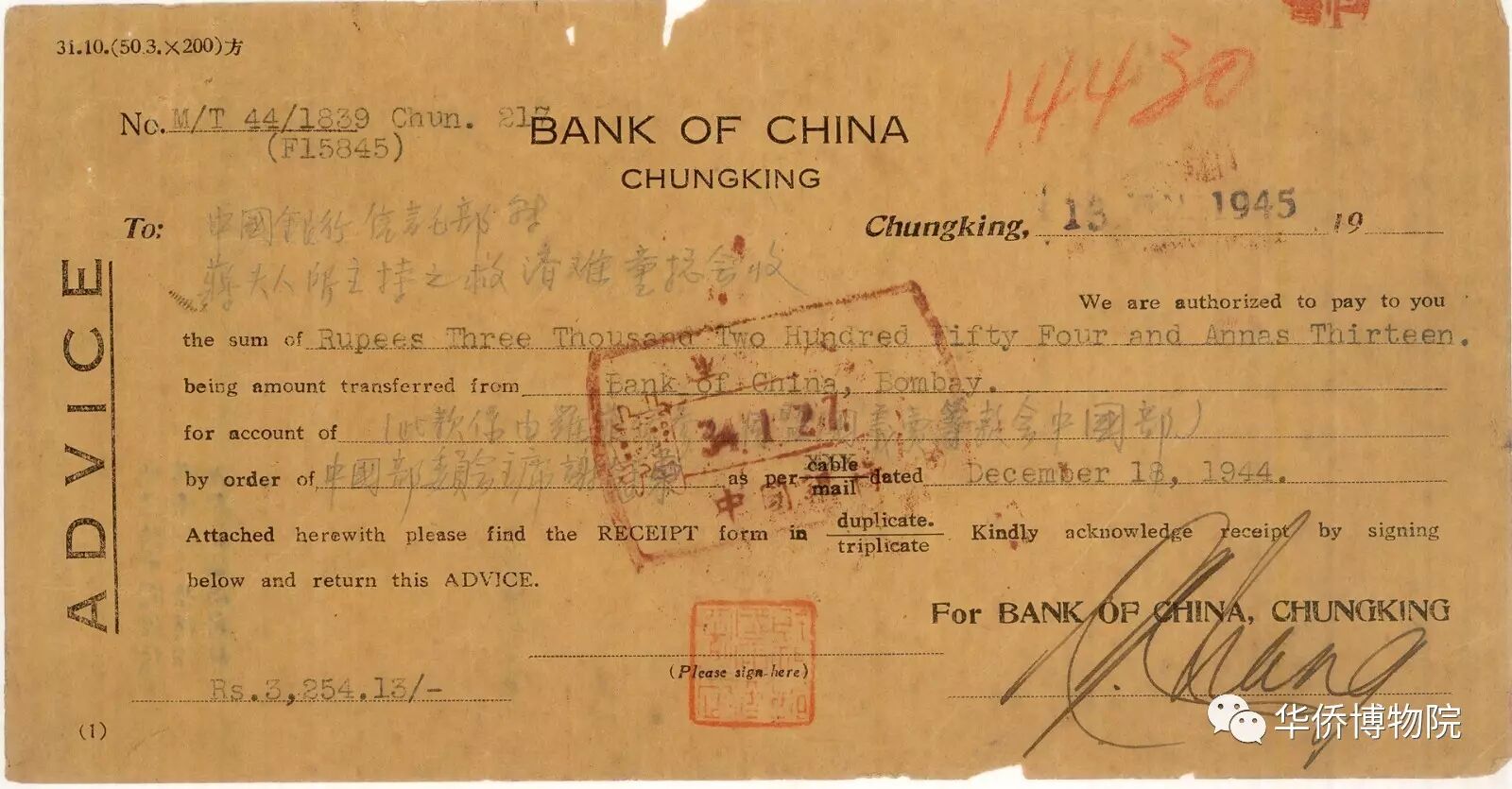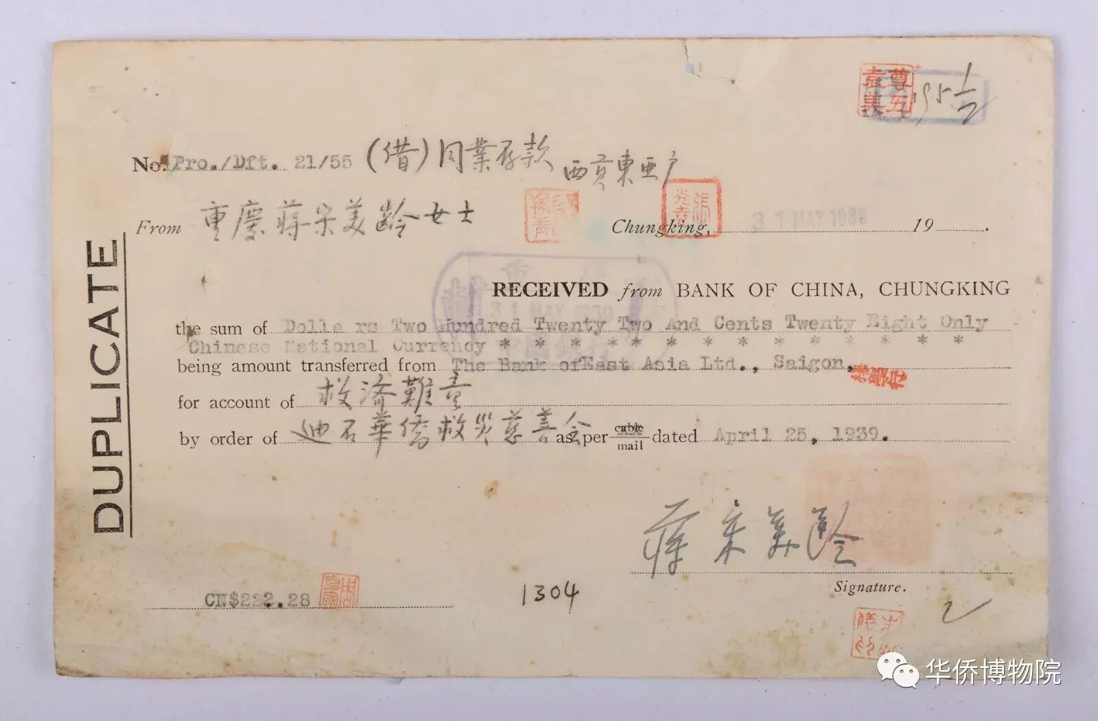 左:1939年蔣宋美齡簽收越南迪石華僑救災(zāi)慈善會(huì)救濟(jì)難童匯款票據(jù)