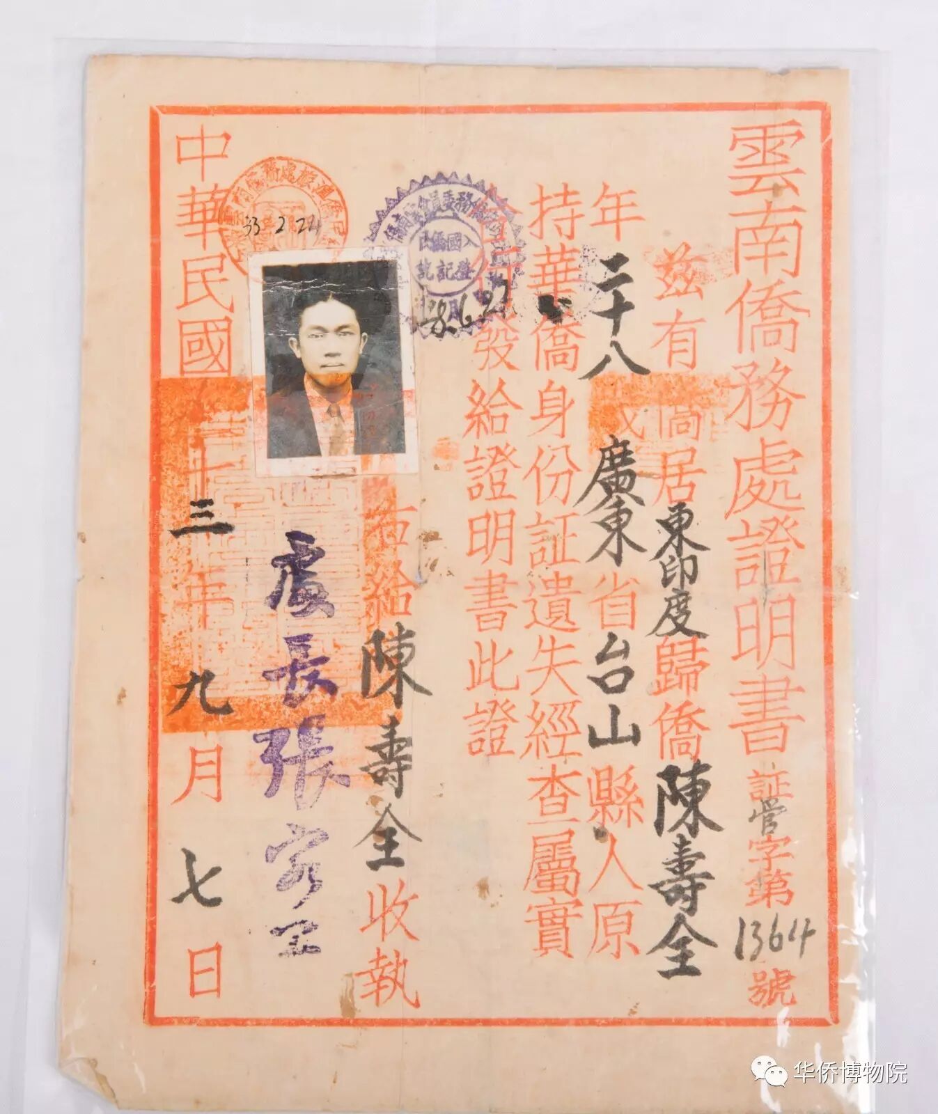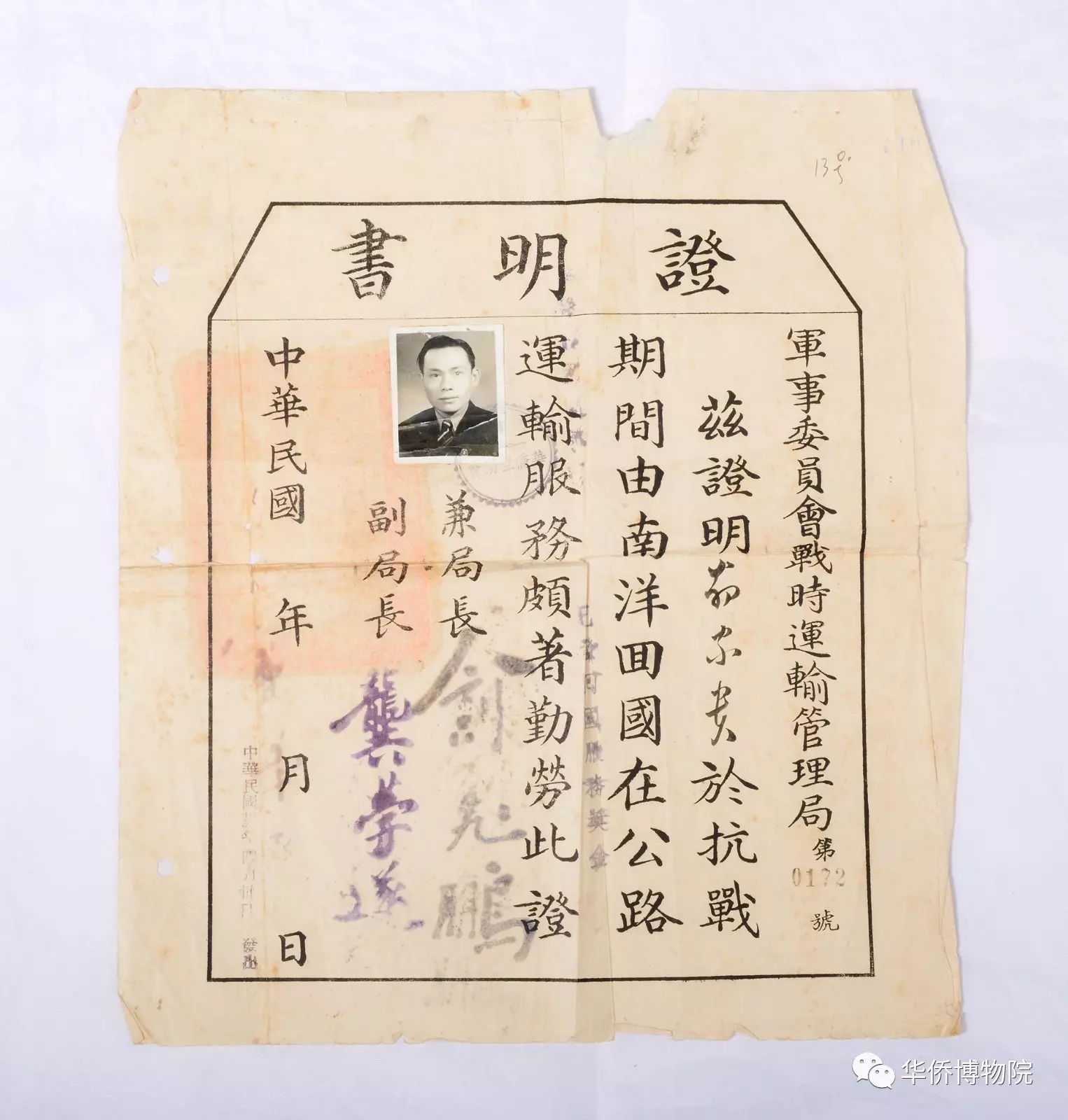 左:1944年南僑機(jī)工陳壽全云南僑務(wù)處證明書(shū)