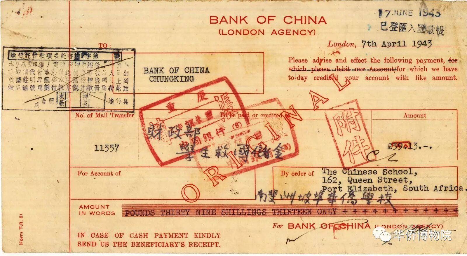 左:1943年南斐洲坡埠華僑學(xué)校匯財(cái)政部學(xué)生救國(guó)儲(chǔ)金票據(jù)