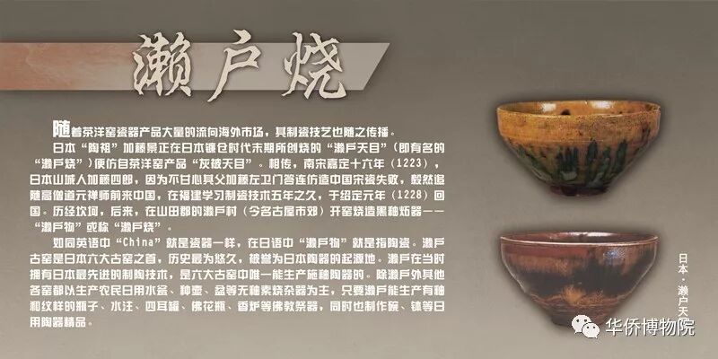 隨著茶洋窯瓷器產(chǎn)品大量的流向海外市場(chǎng),其制瓷技藝也隨之傳播至世界各國。如在日本被譽(yù)為 “陶祖”的加藤四郎左衛(wèi)門氏,在宋代曾隨道元禪師到福建學(xué)習(xí)制瓷技術(shù)六年,回國后在瀨戶開窯燒造黑釉炻器——“瀨戶物”或稱“瀨戶燒”,其主要仿自“灰被天目”。