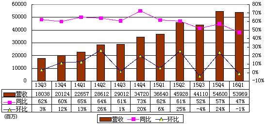 京東集團(tuán)2016年第一季度凈收入為540億元(約84億美元),同比增長(zhǎng)47%。本季度交易總額與凈收入的增長(zhǎng)主要得益于2016年第一季度京東活躍用戶數(shù)及完成訂單量的增長(zhǎng)。