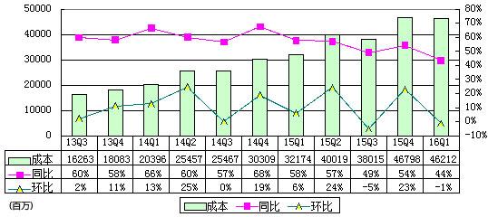 京東2016年第一季度成本為462.12億元,較上一季度減少1%,較上年同期增長(zhǎng)44%。