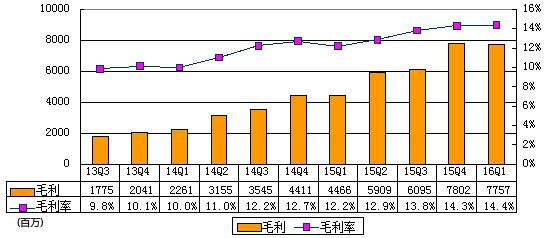 京東2016年第一季度毛利為77.57億元,較上一季度出現(xiàn)下降,京東2016年第一季度毛利率為14.4%,上一季度為14.3%,上年同期為12.2%,可以看出,京東的毛利率在持續(xù)改善。