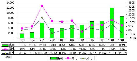 京東2016年第一季度費(fèi)用為86.21億元,較上一季度減少28.4%,較上年同期增長(zhǎng)63%。