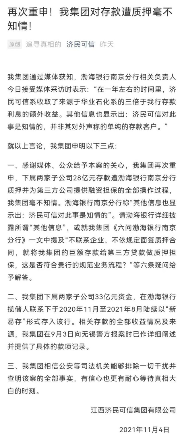 11月4日晚間,作為事件存款方的江西濟民可信集團有限公司,通過其微信公眾號發(fā)布文章《再次重申!我集團對存款遭質(zhì)押毫不知情!》,就28億元存款質(zhì)押事件回應(yīng)渤海銀行南京分行相關(guān)采訪。
