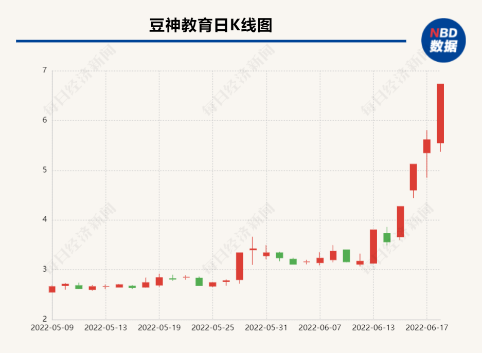 資本市場(chǎng)的反應(yīng)極快。6月20日下午一開(kāi)盤(pán),豆神教育直線(xiàn)漲停,報(bào)收于6.73元/股,成為其6個(gè)交易日內(nèi)的第四個(gè)漲停板。