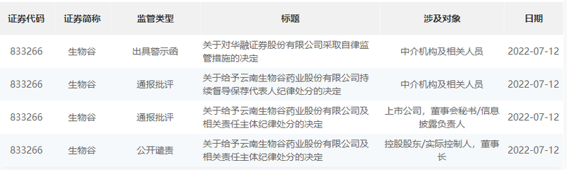 于是,北交所對上述違規(guī)行為予以嚴(yán)肅處理,給予控股股東金沙江以及生物谷實際控制人、時任董事長兼總經(jīng)理林艷和公開譴責(zé)的紀(jì)律處分;給予生物谷以及時任財務(wù)總監(jiān)兼董事會秘書賀元通報批評的紀(jì)律處分;給予保薦代表人梁立群、張見通報批評的紀(jì)律處分,對華融證券股份有限公司采取出具警示函的自律監(jiān)管措施。