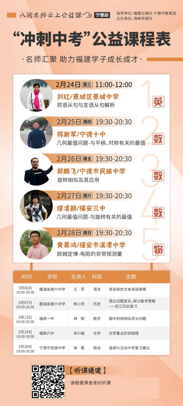 重要消息! @所有福建中考生 注意啦!注意啦!注意啦! 名師云上直播 助力中考沖刺 !!! 就在今晚19:30! 第二課公益課準(zhǔn)時(shí)開講! 名師即將開講中考數(shù)學(xué)備考內(nèi)容! 點(diǎn)擊下圖即可觀看公益課直播 此次“八閩名師云上公益課”寧德站活動(dòng) 由福建日報(bào)社、寧德市教育局指導(dǎo) 海峽導(dǎo)報(bào)社主辦 活動(dòng)以“疫情備考 名師支招”為主題 邀請10位優(yōu)質(zhì)學(xué)校的初三名師 為沖刺中考的學(xué)...