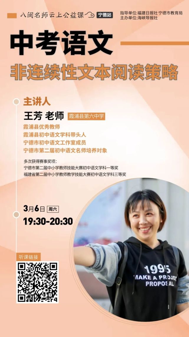 今晚公益直播課的主講老師王芳,來自霞浦縣第六中學(xué),是霞浦縣優(yōu)秀教師,霞浦縣初中語文學(xué)科帶頭人,寧德市初中語文工作室成員,寧德市第二屆初中語文名師培養(yǎng)對象,獲得寧德市第二屆中小學(xué)教師技能大賽初中語文學(xué)科一等獎,福建省第二屆中小學(xué)教師教學(xué)技能大賽初中語文學(xué)科三等獎。