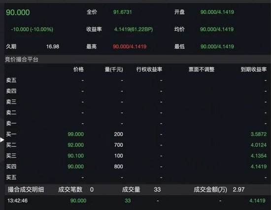 21國(guó)債14盤中臨時(shí)停牌,或與一筆交易有關(guān)。根據(jù)Wind數(shù)據(jù)撮合成交明細(xì)顯示,4月8日13:42:46,一筆以90元每張的價(jià)格、成交量為33手、成交金額為2.97萬(wàn)元的交易達(dá)成,該國(guó)債價(jià)格因此驟降10%。