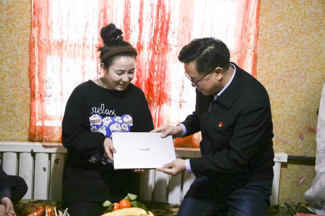 除了精神上的食糧,周小華還貼心地帶來了一臺嶄新的華為筆記本電腦,他說:“我今天還要送你一個禮物,因為你讀研究生了,需要更好的學(xué)習(xí)工具,所以我專門買了這臺筆記本電腦送給你,希望能給你提供更大的便利,也希望你帶著這些書和這臺電腦,繼續(xù)進(jìn)行頑強拼搏的青春!”木尼熱激動地接過禮物,千言萬語,化作一句句:“熱合買提(謝謝)......熱合買提(謝謝)......”