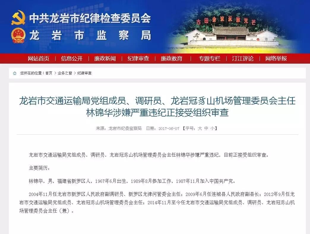 臺(tái)海網(wǎng)6月8日訊 (海峽導(dǎo)報(bào)記者 李大榮)據(jù)福建省龍巖市紀(jì)委監(jiān)察局網(wǎng)站7日消息,龍巖市交通運(yùn)輸局黨組成員、調(diào)研員、冠豸山機(jī)場(chǎng)管理委員會(huì)主任林錦華涉嫌嚴(yán)重違紀(jì),目前正接受組織審查。