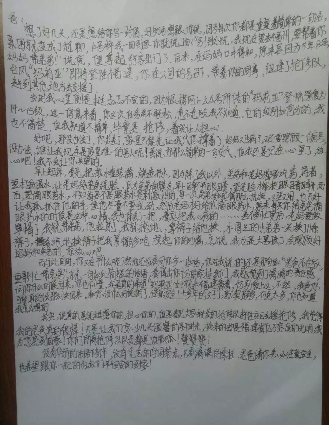 想了好幾天,還是想給你寫一封信。好多話想跟你說,因為每次你都是重復著簡單的一句話,氣氛就變得有些尷尬。10號中午我一回到家,你就說了句:“別到處玩,我現(xiàn)在要去福州,要幫著你媽媽帶弟弟!”說完,便拿起行李出門了。后來,從媽媽口中得知,原來是因為今年8號臺風“瑪莉亞”即將登陸福建,你在公司的號召下,帶著你的同事,組建了搶修隊,趕到其他地方去支援了。