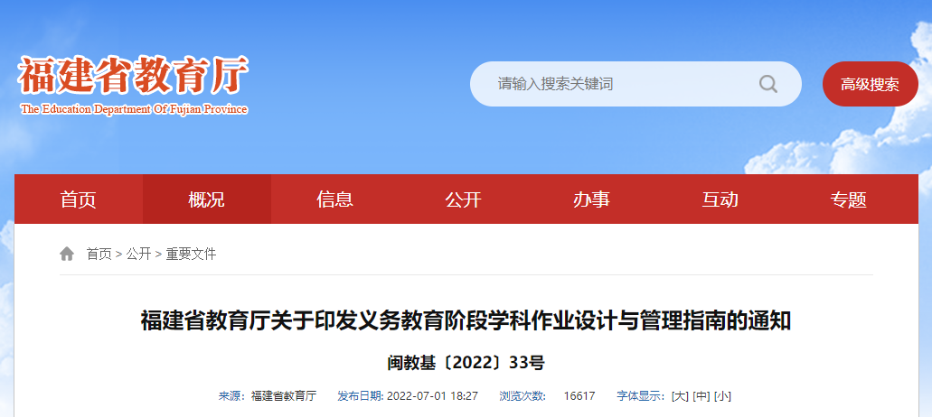 臺(tái)海網(wǎng)7月2日訊 7月1日,福建省教育廳官網(wǎng)發(fā)布《福建省教育廳關(guān)于印發(fā)義務(wù)教育階段學(xué)科作業(yè)設(shè)計(jì)與管理指南的通知》(以下簡稱《通知》),指出可通過設(shè)立無作業(yè)日、緩做、補(bǔ)做等機(jī)制,豐富作業(yè)類型方式,加強(qiáng)作業(yè)彈性化、人性化管理。