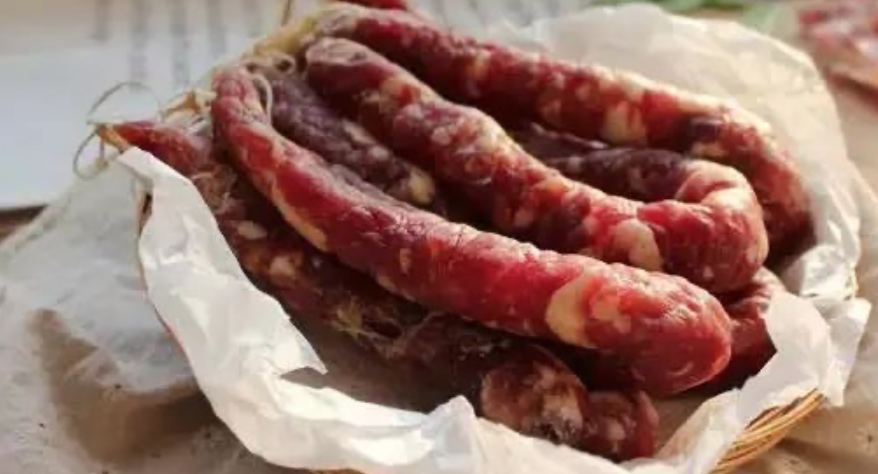 閩南的臘腸,閩南語里叫“風(fēng)墻”。精選豬前腿肉,加入優(yōu)質(zhì)高粱酒、白糖、少許鹽和味精提味,自然日曬風(fēng)干,豬肉與高粱酒經(jīng)過發(fā)酵醇化,達(dá)到最完美的效果。成品半干,口味醇香,絲絲的甜味,是漳州人春節(jié)標(biāo)配的一道美食。