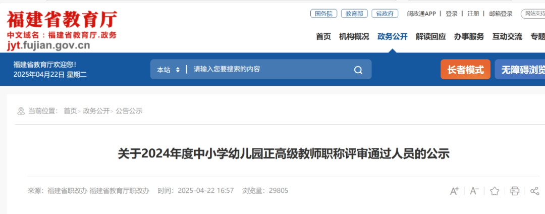剛剛,福建省教育廳公示2024年度中小學(xué)幼兒園正高級教師職稱評審?fù)ㄟ^人員名單。詳情如下——