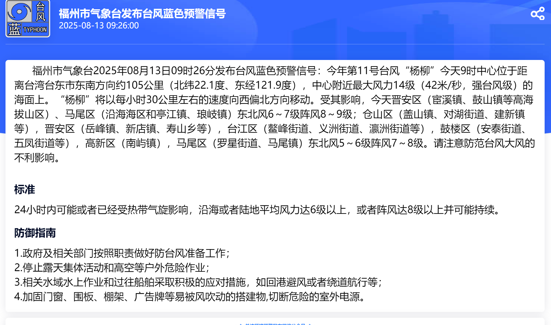 福州市氣象臺2025年08月13日09時26分發(fā)布臺風(fēng)藍(lán)色預(yù)警信號:今年第11號臺風(fēng)“楊柳”今天9時中心位于距離臺灣臺東市東南方向約105公里(北緯22.1度、東經(jīng)121.9度),中心附近最大風(fēng)力14級(42米/秒,強臺風(fēng)級)的海面上。“楊柳”將以每小時30公里左右的速度向西偏北方向移動。受其影響,今天晉安區(qū)(宦溪鎮(zhèn)、鼓山鎮(zhèn)等高海拔山區(qū))、馬尾區(qū)(沿海海區(qū)和亭江鎮(zhèn)、瑯岐鎮(zhèn))東北風(fēng)6~7級陣風(fēng)8~9級;倉山區(qū)(蓋山鎮(zhèn)、對湖街道、建新鎮(zhèn)等),晉安區(qū)(岳峰鎮(zhèn)、新店鎮(zhèn)、壽山鄉(xiāng)等),臺江區(qū)(鰲峰街道、義洲街道、瀛洲街道等),鼓樓區(qū)(安泰街道、五鳳街道等),高新區(qū)(南嶼鎮(zhèn)),馬尾區(qū)(羅星街道、馬尾鎮(zhèn))東北風(fēng)5~6級陣風(fēng)7~8級。請注意防范臺風(fēng)大風(fēng)的不利影響。