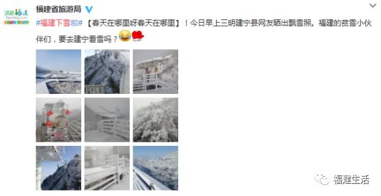 福建省旅游局官方微博發(fā)布消息稱:#福建下雪啦# 【春天在哪里呀春天在哪里】!今日早上三明建寧縣網(wǎng)友曬出飄雪照。福建的貧雪小伙伴們,要去建寧看雪嗎?