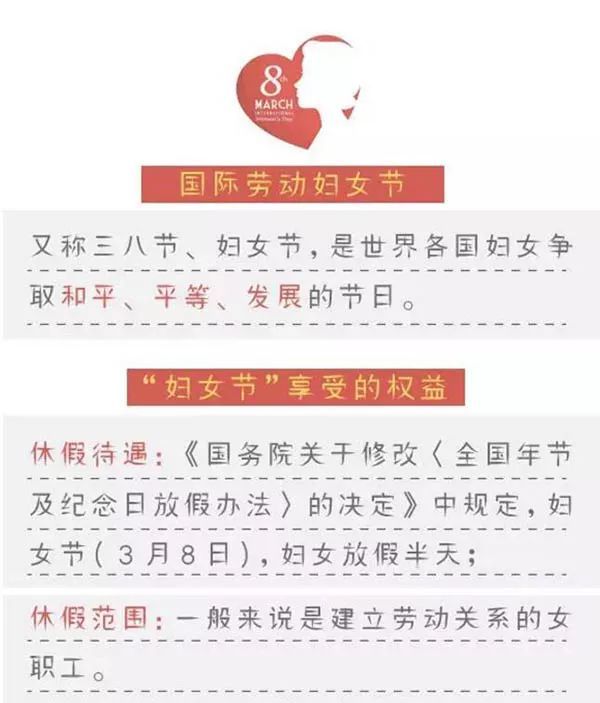 臺海網(wǎng)3月8日訊 據(jù)海峽都市報微信報道,婦女放假半天的規(guī)定,出自國務(wù)院出臺的《全國年節(jié)及紀念日放假辦法》第三條規(guī)定,三八婦女節(jié)是部分公民放假的節(jié)日,因此婦女節(jié)放假屬于“法定的半天節(jié)假日”。