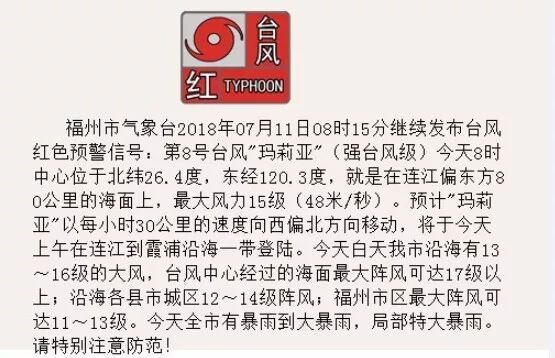 作為一個(gè)快手臺(tái)風(fēng),“瑪莉亞”具有增強(qiáng)快、移速快、影響快的特點(diǎn),同一時(shí)間同一地點(diǎn)的風(fēng)雨持續(xù)時(shí)間可能不會(huì)超過(guò)12個(gè)小時(shí),甚至更短,但是它的風(fēng)雨影響有可能會(huì)突然出現(xiàn)并迅速加強(qiáng),公眾需關(guān)注臨近預(yù)報(bào),提高警惕。