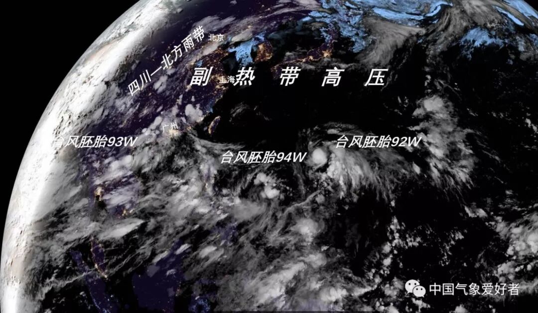7月13日晚三個臺風胚胎位置示意圖,中氣愛在H8衛(wèi)星云圖上標注