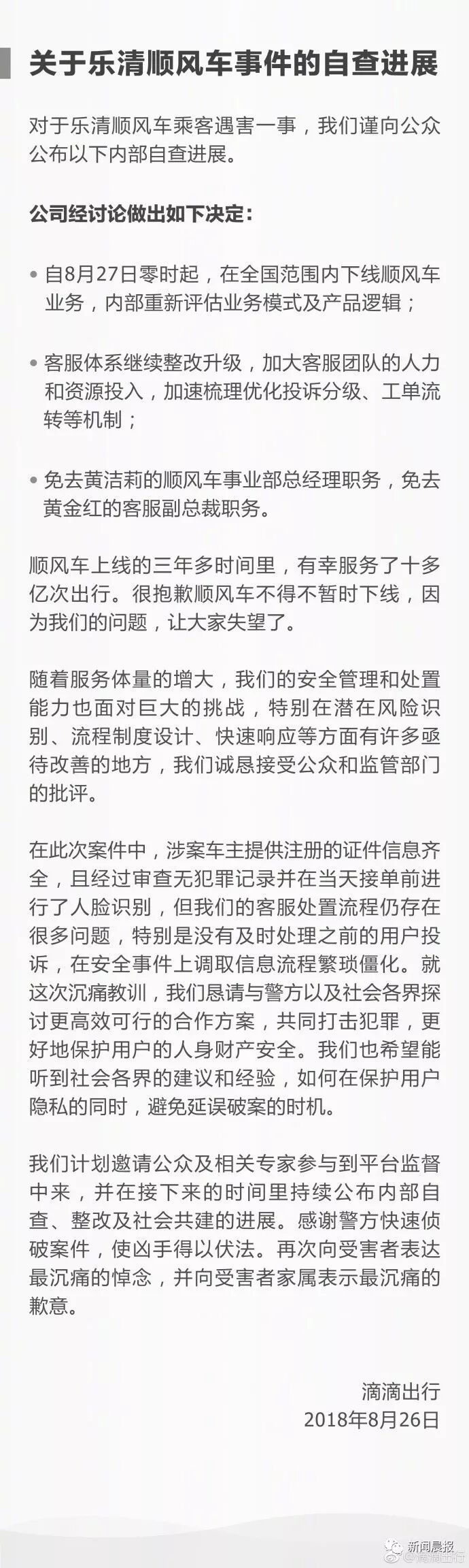 今天中午,滴滴發(fā)布關(guān)于樂(lè)清順風(fēng)車(chē)事件自查進(jìn)展,全國(guó)范圍下架順風(fēng)車(chē)業(yè)務(wù),兩位高管被免職。