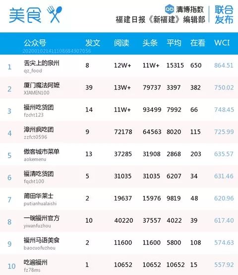 本期美食榜整體變化不大,前三名依舊是“舌尖上的泉州”“廈門魔法阿嬤”“福州吃貨團”。