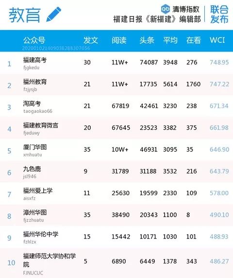 熱文方面,“福州教育”的《安全出行 共享文明——致全市師生及學生家長的一封信》閱讀量7W+,排在榜首。