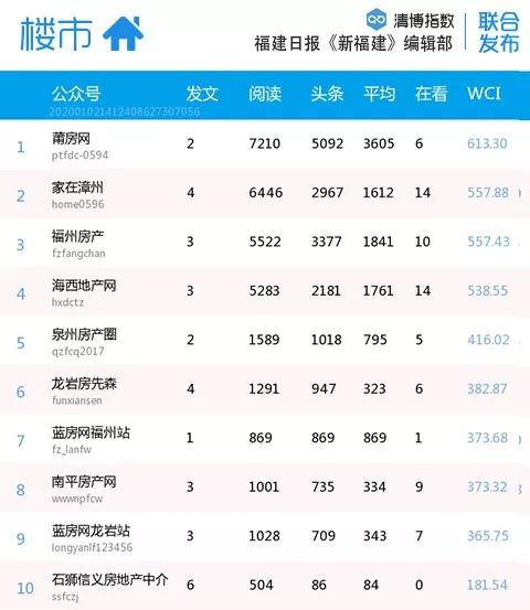 本期樓市整體熱度略有上升。“家在漳州”“福州房產(chǎn)”分別由上期第4、5名升至本期第2、3名,“南平房產(chǎn)網(wǎng)”“石獅信義房地產(chǎn)中介”為本周新入榜。