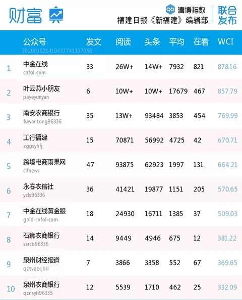 本期財富榜“葉云燕小朋友”登上榜首。“石獅農(nóng)商銀行”“泉州農(nóng)商銀行”新入榜。熱文方面,“葉云燕小朋友”的文章熱度較高,4篇文章2w+以上。