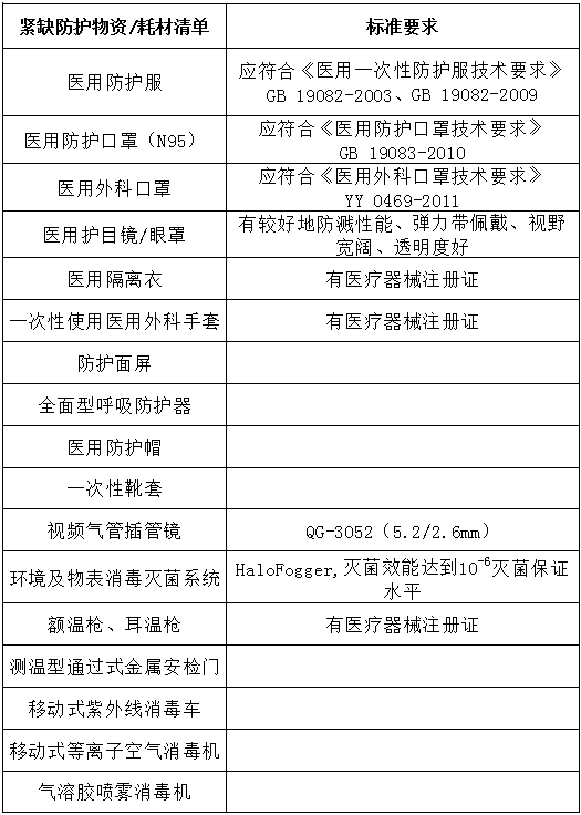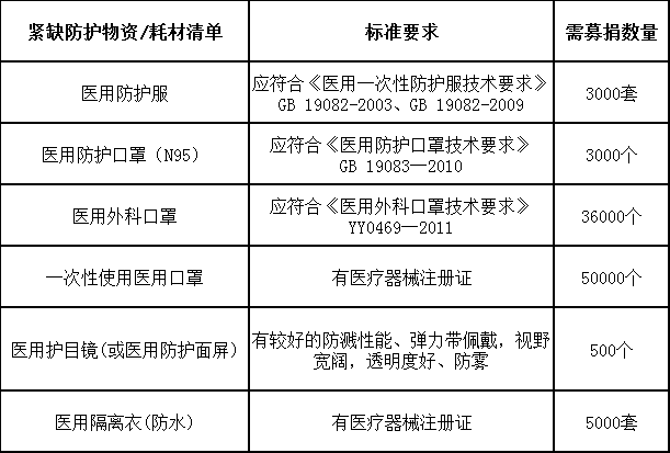 由于醫(yī)院防護(hù)物資短缺,為切實(shí)保障疫情防控需要,更好地服務(wù)廣大人民群眾,醫(yī)院開通接受社會(huì)捐贈(zèng)通道,接受合法合規(guī)的急需短缺防護(hù)物資,清單如下: