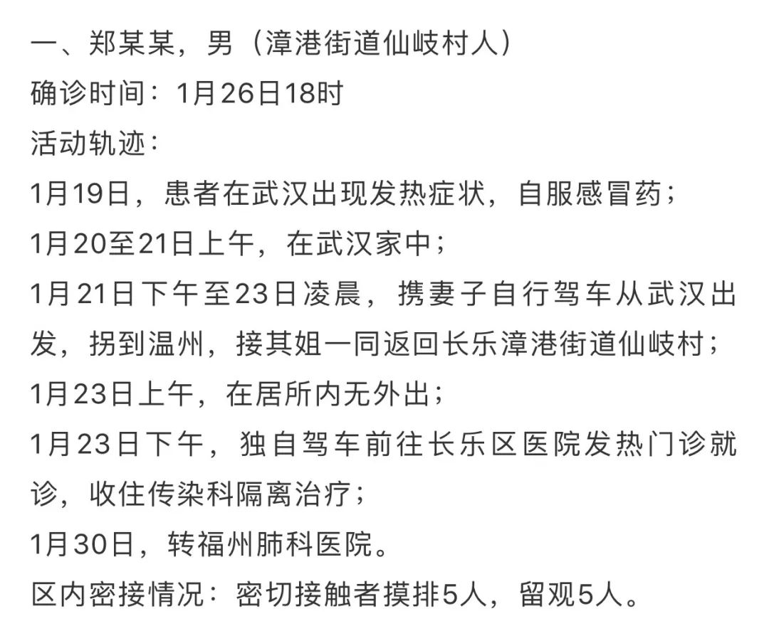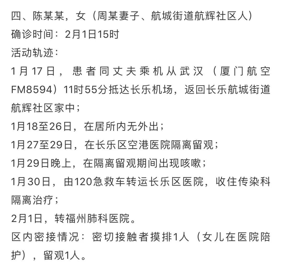 2月2日,福州市長樂區(qū)新型肺炎防控工作應(yīng)急指揮部公布4名確診人員活動軌跡,包括具體時間節(jié)點、途經(jīng)地等信息。如有“接觸”史的市民請緊急上報,并做好自我隔離。