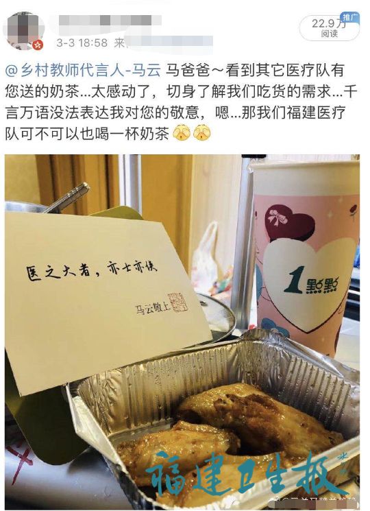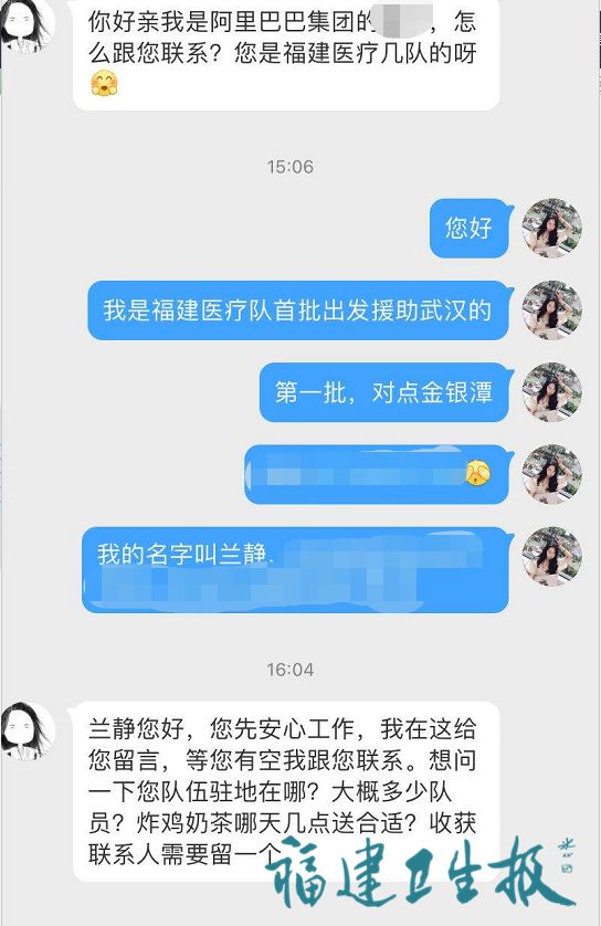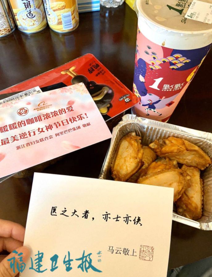 據(jù)了解,為表達(dá)對(duì)援鄂白衣天使的敬意,馬云陸續(xù)向支援湖北醫(yī)療隊(duì)員送出下午茶,這也是福建馳援武漢醫(yī)療隊(duì),首次“點(diǎn)單”成功。在與阿里巴巴工作人員的交接中,除了奶茶炸雞,蘭靜還為福建首批醫(yī)療隊(duì)爭(zhēng)取到了150件的沖鋒衣,并于明日送到醫(yī)療隊(duì)駐地。
