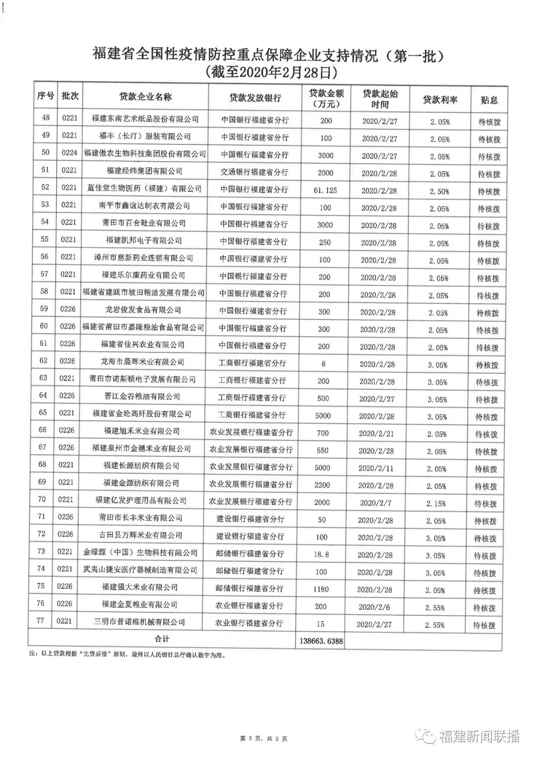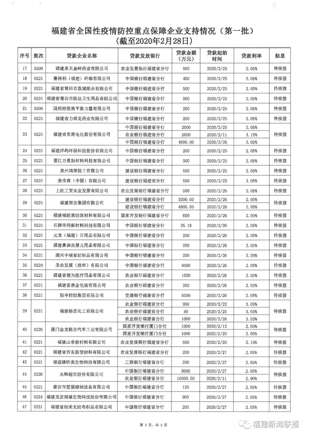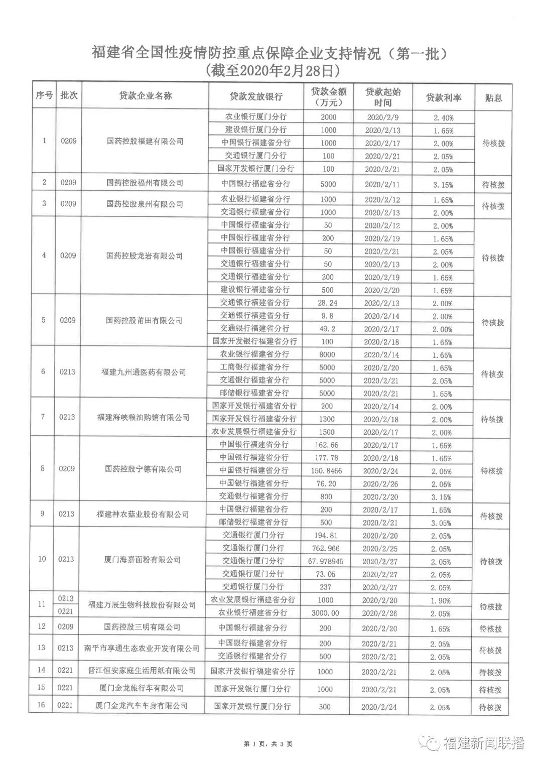 為做好福建省疫情防控重點(diǎn)保障企業(yè)資金支持有關(guān)工作,按照財(cái)政部有關(guān)規(guī)定,對(duì)全國(guó)疫情防控重點(diǎn)保障企業(yè)名單內(nèi)的我省企業(yè)截止2月28日已從中國(guó)銀行等9家全國(guó)性銀行駐閩分支機(jī)構(gòu)獲得的貸款情況予以公示。
