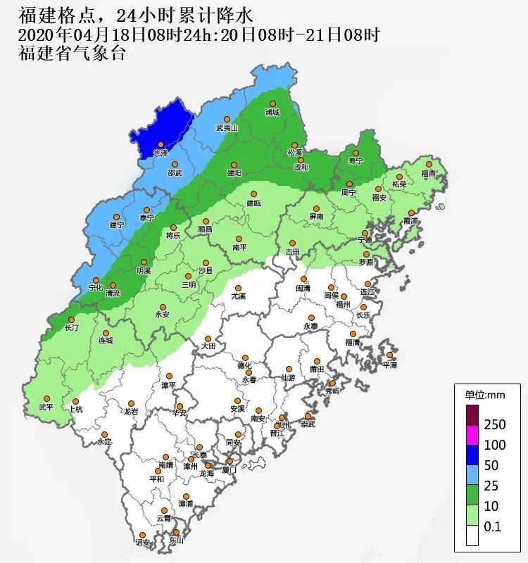 20日,全省陰有陣雨或雷陣雨,其中三明、南平、寧德的部分有中到大雨,南平的局部有暴雨,龍巖的局部有中雨。