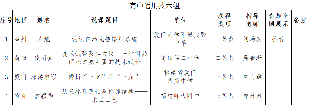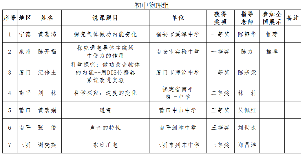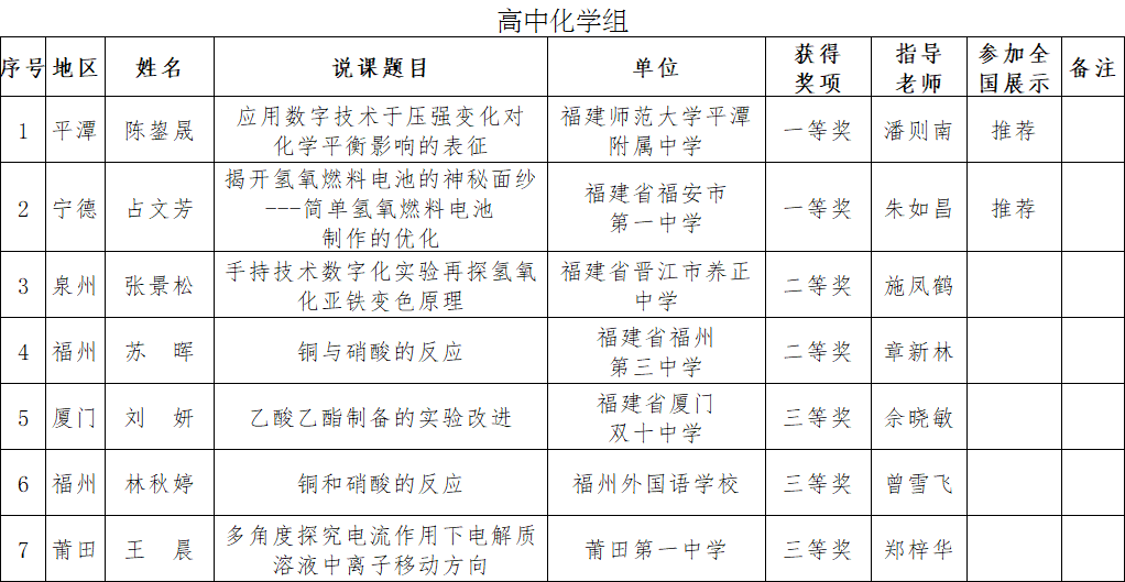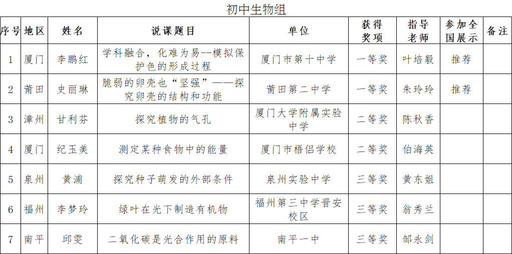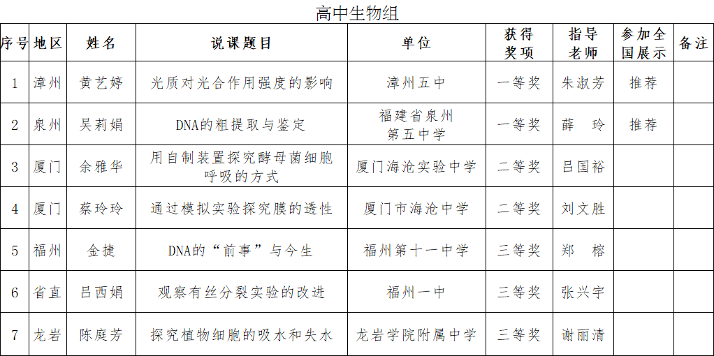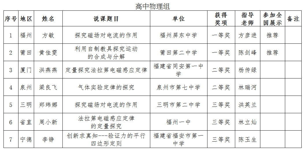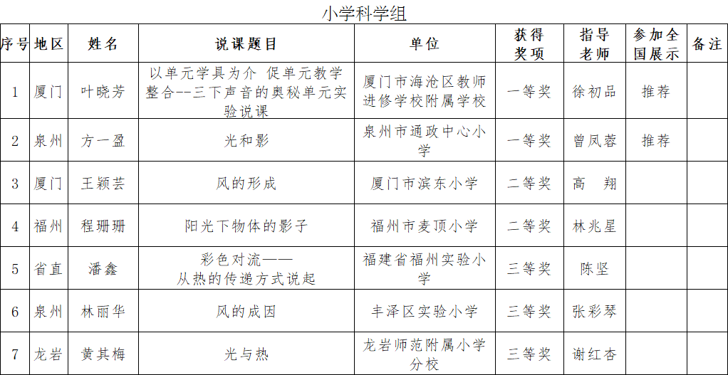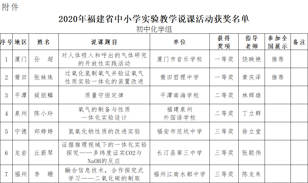 根據(jù)《福建省教育廳辦公室關于舉辦2020年全省中小學實驗教學說課活動的通知》(閩教辦基〔2020〕15號)要求,在各地申報的基礎上,經專家評審確定——