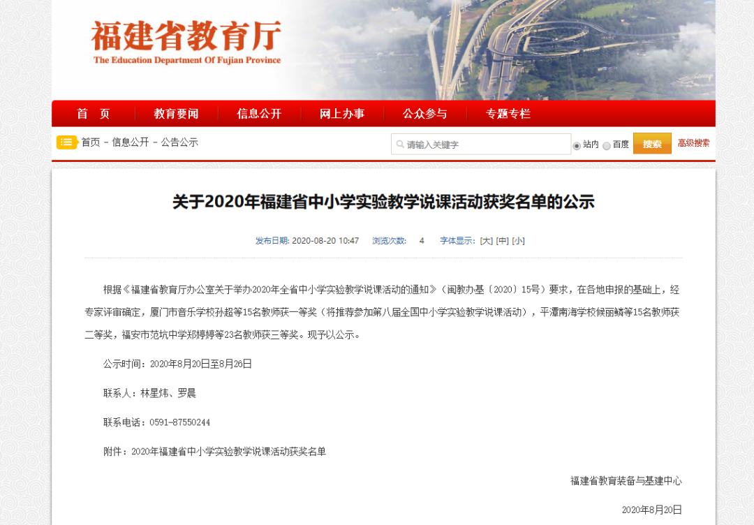 臺海網(wǎng)8月20日訊 據(jù)福建日報-新福建APP報道 好消息!2020年福建省中小學實驗教學說課活動獲獎名單公示啦!