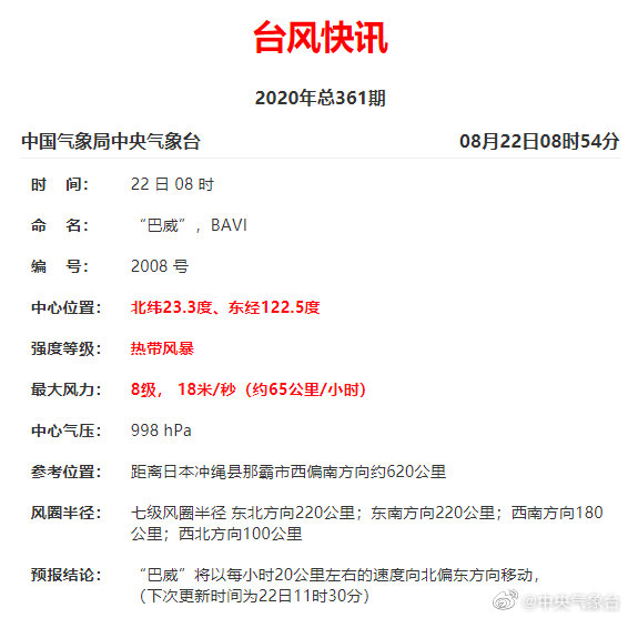 臺海網(wǎng)8月22日訊 據(jù)福建日報APP-新福建報道 最新消息:今天早上8點(diǎn),今年第8號臺風(fēng)“巴威”生成。
