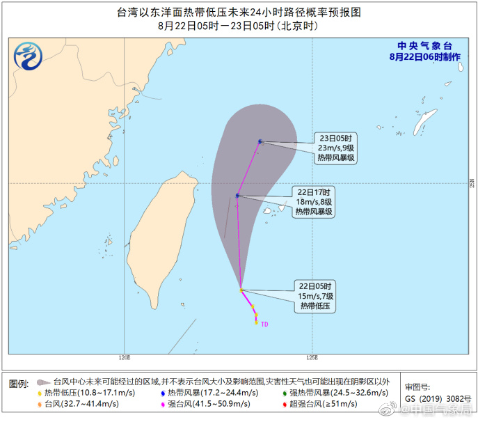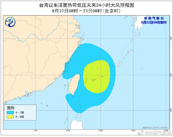 臺灣島以東洋面熱帶低壓于昨天晚上8點(diǎn)鐘生成,22日早晨5點(diǎn)鐘其中心位于日本沖繩那霸西南方約630公里的洋面上,中心附近最大風(fēng)力有7級(15米/秒)。 預(yù)計,低壓中心將以每小時20公里左右的速度向偏北方向移動,強(qiáng)度逐漸加強(qiáng),將于今天白天發(fā)展為今年第8號臺風(fēng),于今天傍晚移入東海南部海面,并逐漸轉(zhuǎn)向北偏東方向移動。