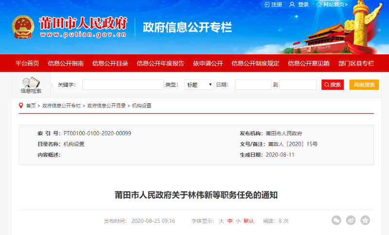 莆田市人民政府關(guān)于林偉新等職務(wù)任免的通知