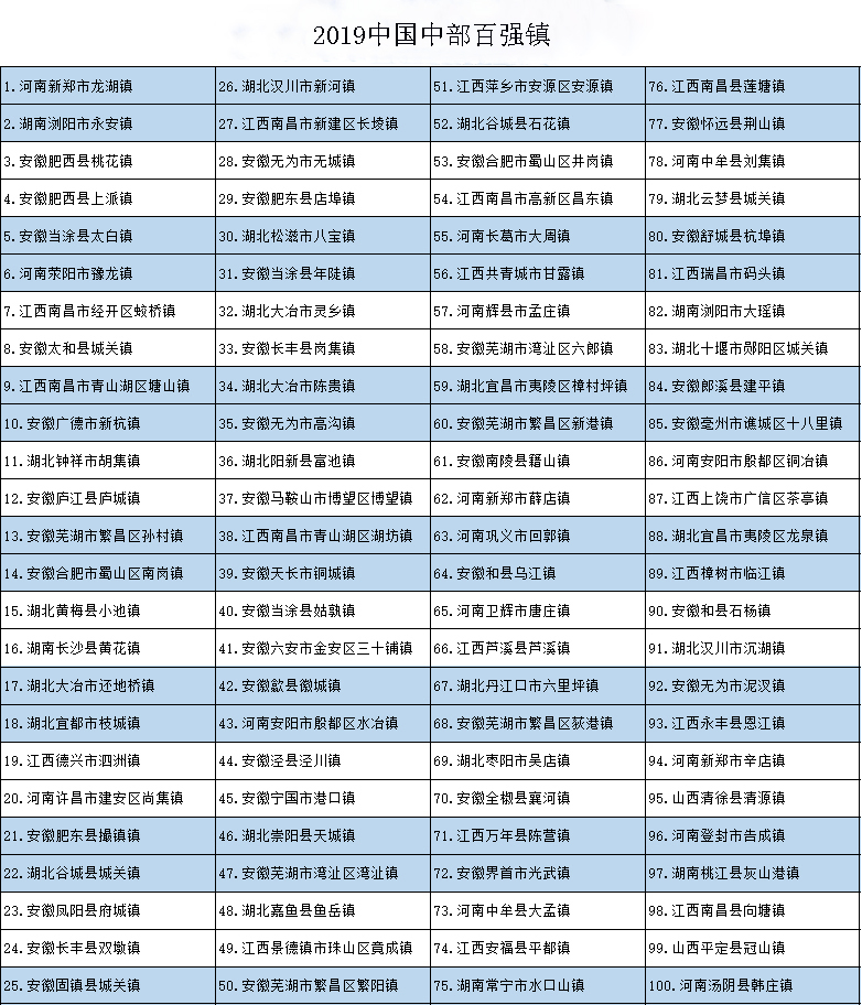 《報(bào)告》同時(shí)公布了2019中國中部百強(qiáng)鎮(zhèn)和西部百強(qiáng)鎮(zhèn)榜單。中部百強(qiáng)鎮(zhèn)分別為安徽40個(gè)、湖北20個(gè)、江西18個(gè)、河南15個(gè)、湖南5個(gè)、山西2個(gè)。中部百強(qiáng)鎮(zhèn)總?cè)丝谄骄鶠?1.16萬人;公共財(cái)政收入平均為6.21億元,較上年增加1.01億元;工業(yè)企業(yè)數(shù)平均為282個(gè),較上年減少25個(gè);規(guī)模以上工業(yè)企業(yè)數(shù)平均為41個(gè),較上年增加1個(gè)。西部百強(qiáng)鎮(zhèn)分別為廣西26個(gè)、陜西22個(gè)、內(nèi)蒙古18個(gè)、云南13個(gè)、四川10個(gè)、貴州9、寧夏1個(gè)、新疆1個(gè)。西部百強(qiáng)鎮(zhèn)總?cè)丝谄骄鶠?.27萬人,公共財(cái)政收入平均為4.65億元,工業(yè)企業(yè)數(shù)平均為137個(gè),規(guī)模以上工業(yè)企業(yè)數(shù)平均為19個(gè)。