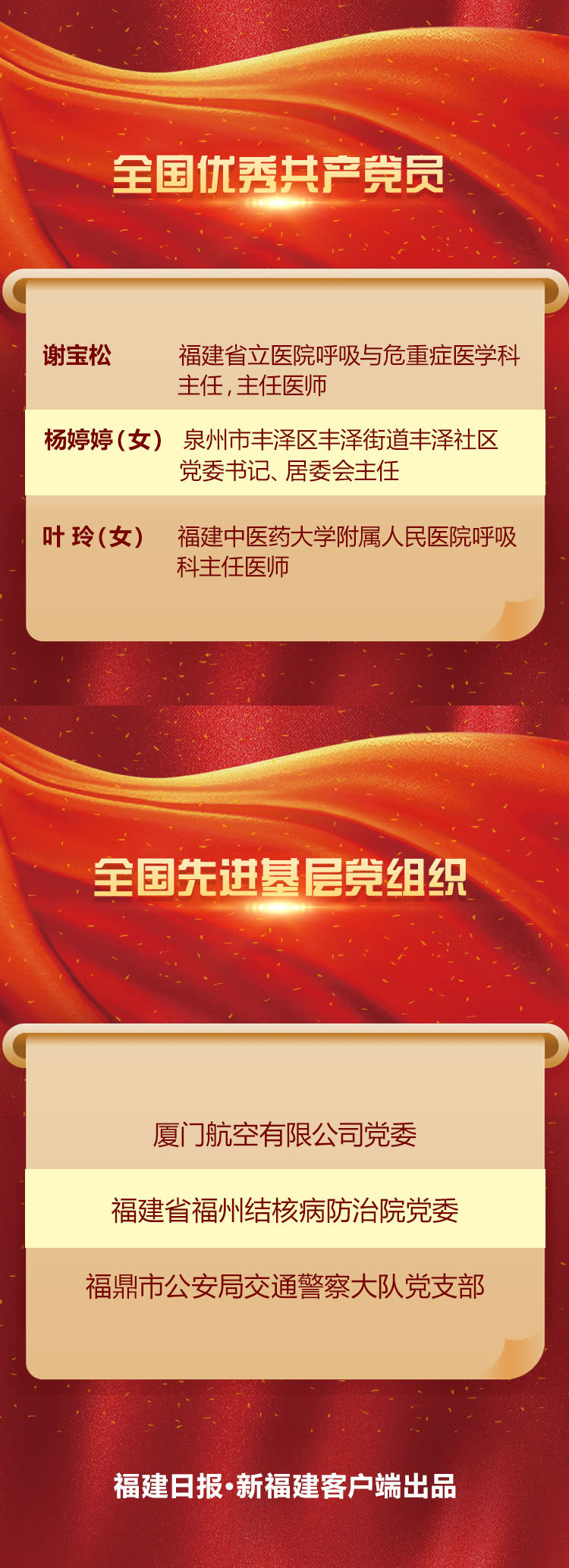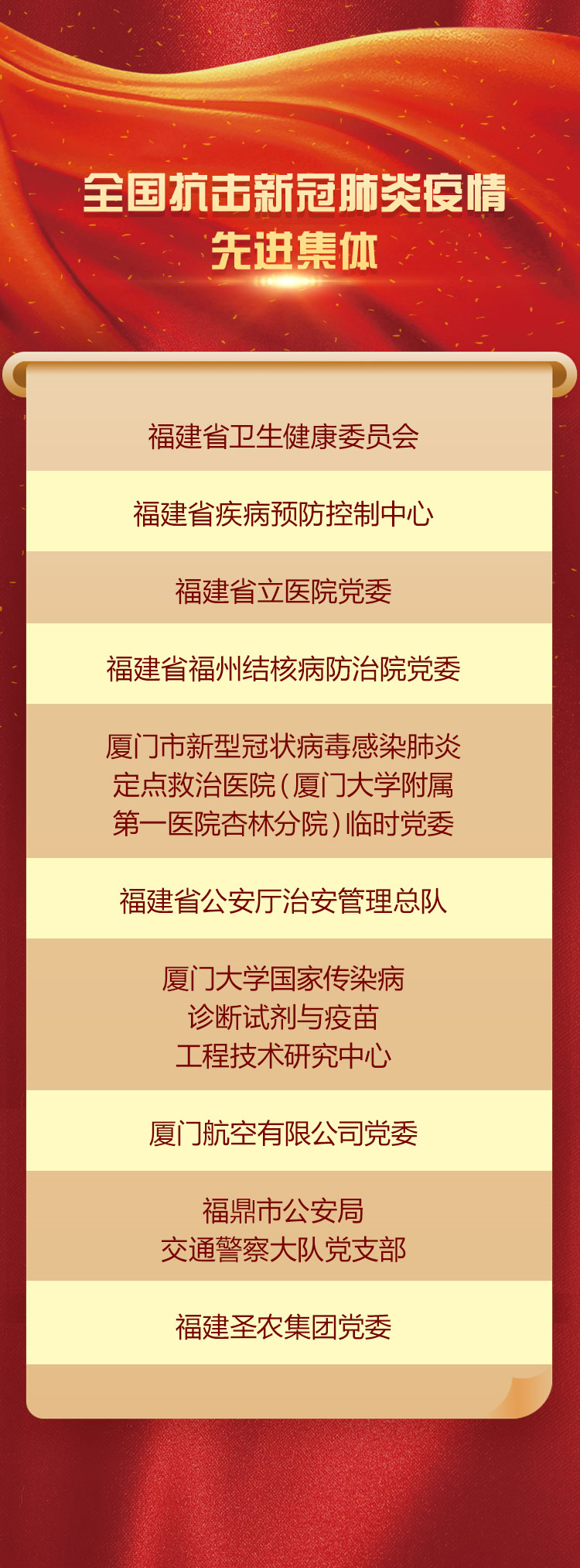 其中,福建有25人獲得“全國(guó)抗擊新冠肺炎疫情先進(jìn)個(gè)人”稱號(hào)、10個(gè)集體獲得“全國(guó)抗擊新冠肺炎疫情先進(jìn)集體”稱號(hào),3人獲得“全國(guó)優(yōu)秀共產(chǎn)黨員”稱號(hào)、3個(gè)基層黨組織獲得“全國(guó)先進(jìn)基層黨組織”稱號(hào),向他們致敬!